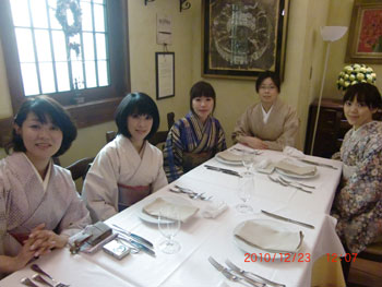 最初の写真はおしとやかに。左から数ヶ月で袋帯まで着装できるようになったイタリア通のスーパー主婦 Nちゃん。