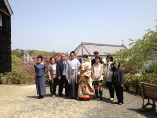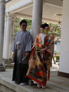 またまだ綺麗な色の花が残っている明治村の前撮り。和装、人気あります。