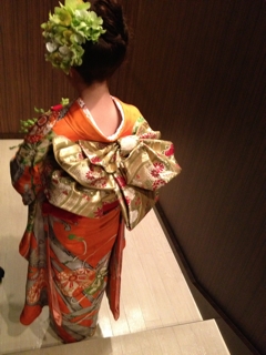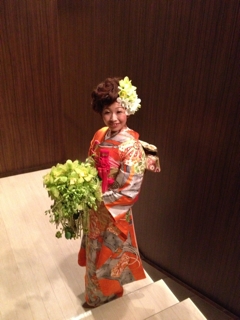 先日の花嫁さんはずっとお世話になっているプランナーさん。中座の衣装はお母様の振袖で、しかもご自分も成人式にもお召しになった思い出深い大切な物。お目出度い熨斗目模様で、絞りも混ざった美しい着物。