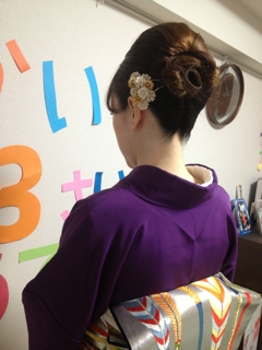 お次はいとこの結婚式に列席のお嬢様。前髪に編み込みを平行して作りました。古典柄のお母様のお着物をお召しですので、かっちりした中にも編み込みやカールで可愛らしさを出しました。綺麗な青ですね。