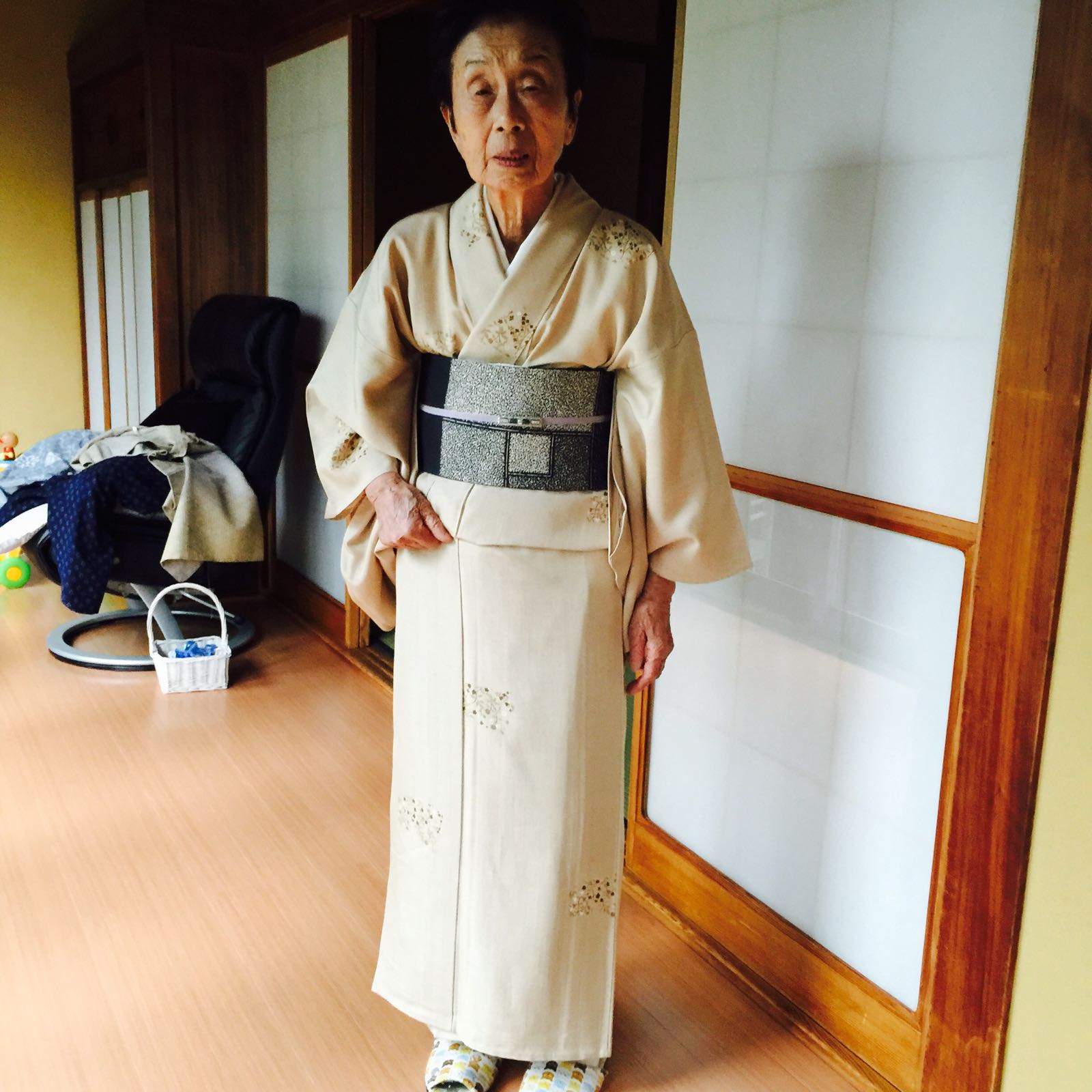 今迄ずっとご自分で着付けされていた方でしたが、急に腕が上がらなくなり、裾を決めたり帯をあげたりのお手伝いさせて頂きました。あとはご自分の着方がおありになるので、お任せです。米寿のお祝いをされたばかり。年齢が行くと襟芯も首に当たって辛いそうです。色んな小物を排除した楽な着付けは、大切な事ですね。